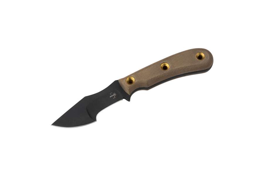 Das charakteristische Design, das Tracker-Konzept mit den zwei voneinander abgesetzten Schliffen, der schocklastunempfindliche Kohlenstoffstahl 1095 und das bemerkenswerte Preis-Leistungs-Verhältnis machten den Böker Plus Mini Tracker von Dave Wenger schnell zu einem Topseller in der Bushcraft- und Outdoor-Szene. Während bei den größeren Varianten des Trackers der vordere Klingenteil vor Allem zum Hacken und Spalten geeignet ist, zeigt die Klingenform mit der kleineren Dimension des neuen Böker Plus Micro Tracker ganz andere Vorzüge und Qualitäten. Die Vorteile der beiden Schliffwinkel auf einer Klinge teilt der Micro Tracker mit seinen großen Brüdern. Darüber hinaus lässt sich im kleineren Format mit der vorderen Klingenhälfte hervorragend auf einem Schneidbrett arbeiten und mit der kräftigen Spitze lassen sich im Alltag ausgezeichnet Kartons öffnen. Die Kleine Nase, die die beiden Schliffe voneinander abgrenzt, zieht sich mit Kraft in den Schnitt in weichen Materialien und ist prädestiniert zum Kappen von Schnüren, Leinen und Gurten. Der Feld- und 3D-Bogenschütze schätzt die kompakten Maße, die kräftige Spitze und die archaische Erscheinung beim Herausarbeiten fehlgeschossener Pfeile. Das Böker Plus Micro Trapper hat dieselben unverwüstlichen Materialien und dasselbe Finish des Mini Tracker. Ein optisches Highlight setzen die drei sorgfältig versenkt und mit Fase versehenen Messinghohlnieten im Griff.